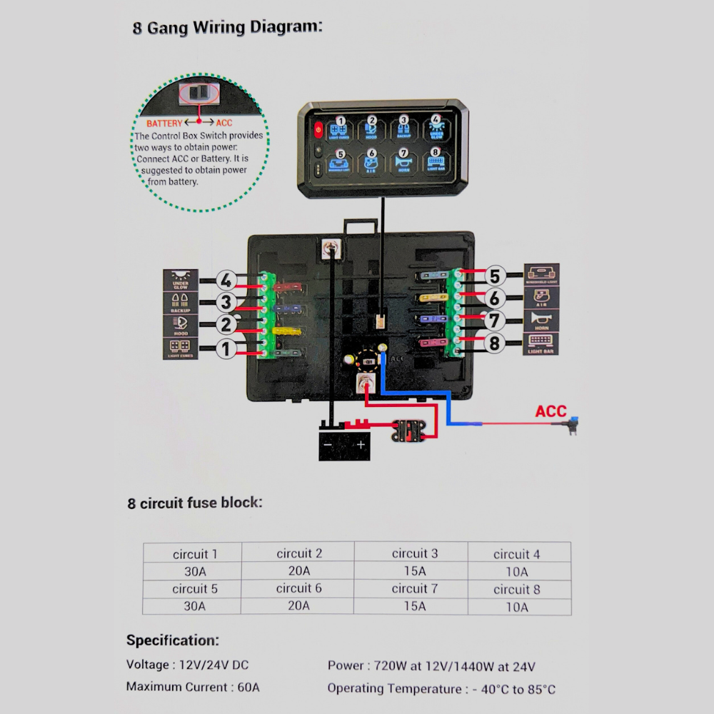 The Control Box Switch provides two ways to obtain power: Connect ACC or Battery. It is suggested to obtain power from battery.